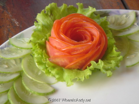 The rest of the day was spent creating wonderful dishes and eating them. We even did a bit of plate decoration creating a rose out of a tomato! Now I’ve dabbled a fair bit with Thai cooking before, but I could not believe how good my tom yam gam soup and green curry tasted. The correct fresh ingredients and the expert instruction were what made them so good. Who knows, some day maybe you’ll sample the goodness when I cook for you… Mr Fish, I believe you will have the pleasure first.