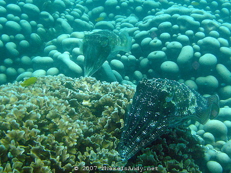 I explained previously how Sharks are the coolest animals on the planet, but I have to say, cuttlefish come close. I was fortunate enough to spend ten minutes or so studying one while snorkeling off the beach in front of our chalet, but even more amazing were the two large ones I saw while diving. The way they just “hover” about with their funky fins that ripple all around their body and the mass of tentacles doing their thing at the front is, in my eyes at least, impressive. Even more so is their ability to change colour to suit the surroundings. The ones we saw did just this, including “rippling” different colours down their body to mimic the sunlight rippling on the sea bed. Like I said, cool.