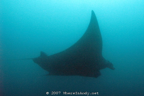 For this dive we dropped down rested on the shole floor. No finning about in the current, just waiting. This was a really different experience for me from the dives I’ve done up to this point. With the visability not more than 6 metres and along with being really rather cold I became fully aware that I was absolutely clueless as to what was out there in the big dark blue open sea, then suddenly it appeared, a huge beast swimming slowly gracefully towards us. No not the elusive thresher but a large manta ray. Another incredible animal. So beautiful “flying” along infront of us with it’s huge wings. Fifteen seconds later it was out of view but those short 15 seconds made the whole two plus hour trip worthwhile. True grin factor. Without my camera I had more time to focus on the ray while it passed by leaving the faffing for someone else, in this case Richard…