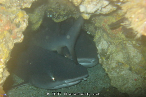 of fish there was plenty to see… scorpion fish, frog fish, lion fish, hermit crabs, anemone fish, shrimps, juvenile harlequin sweetlips (the patterns and fins are as elaborate as its name) sea horses and many of the usual reef fish. Best part for me was peering into a cave only to come face to face with three sharks less than a metre away. Later on we saw two more out in the open swimming about. Incredible.