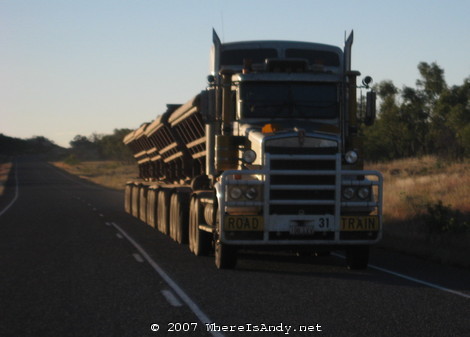 Of great interest, at least to Guillaume and I, were the massive 50 metre long 3 or 4 trailer road trains hurtle towards you at great speed. Not as scary as facing and Indian bus in a Rickshaw but still quite daunting when you have to pull off the road onto the gravel as one of these goliaths passes by.
