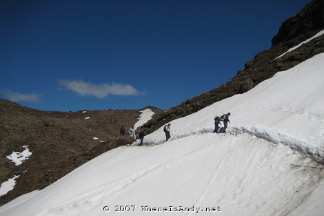 Red Crater was the highest point of the walk and afforded the best views, not to say that the views from any other point were substandard. Even more impressive was the steam coming out of the ground around the crater rim. I’d never seen anything like it and was amazed at how hot the ground was. More so, realising how much snow there was still about. The walk down from Red Crater was good fun, traveling a couple of metres with each step as the stones slid away under foot. Good fun but I can’t imagine the damage the 1000 or so per day walkers do.