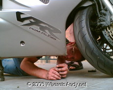 Having adjusted the chain we decided to take the fairings off the bike and have a good look at all the fun stuff below. Something Philippe has never tried before, but for some reason he was very comfortable doing it with me around to help out. We also moved the fuel tank away on it’s hinges and stiffend the rear suspension that is adjustable as standard.