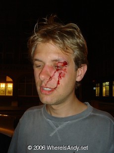 Having started so early, the night was guaranteed to end in disaster and Jacks improved ability to fall over was probably a good sign to leave. On the long walk home Jack was up for a bit of play fighting from which Jon sensibly backed away. Harry, however, did not. After a few friendly punches they both got a bit to involved resulting in Jack getting a clean strike to his poor little brothers head. The result? Well see for yourself: